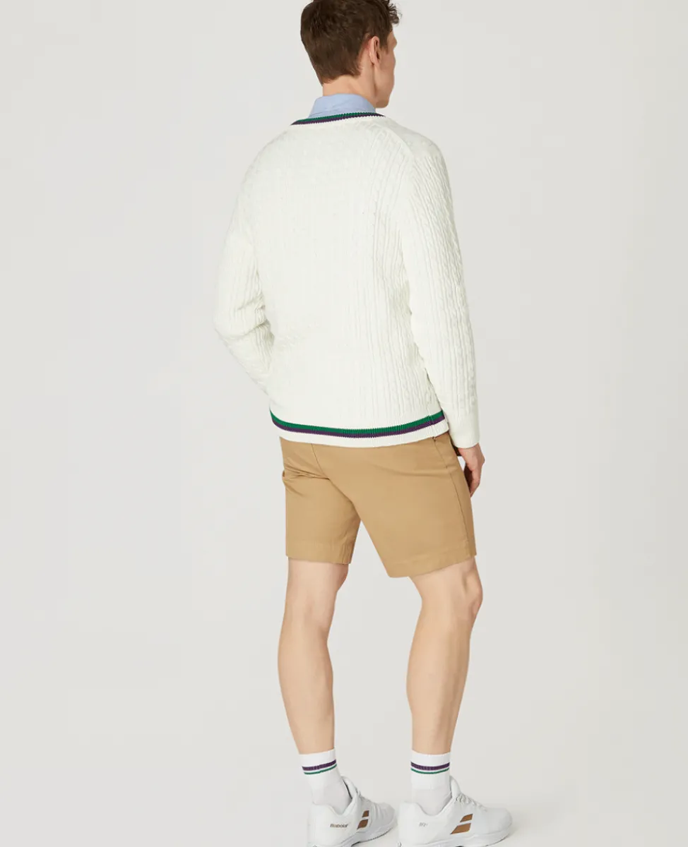Classic styling for the court and clubhouse. This 100% cotton ribbed v-necked pullover shouts style and tradition with its contrasting trim in Wimbledon purple and green. The slightly fitted shape gives a slim silhouette.